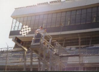 Driving on the Speedway, taking the checkered flag! Crash Dave at the wheel and Stinky in the passenger seat.